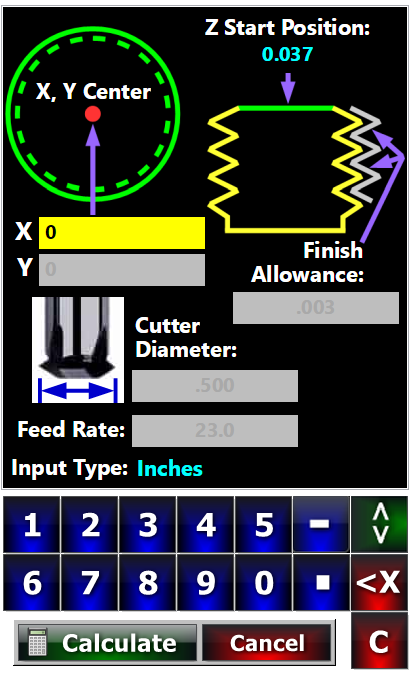 Quickly and easily make a cnc G Code program to mill ID and OD threads on a cnc mill. This is part of the Web Machinist Mobile Pro App: Web Machinist Mobile Pro App has many cnc programming calculators for CNC Machinists, Programmers and QC Inspectors. Thread Milling Calculator, CNC Lathe Radius Calculators, Bolt Circle Calculator, Wheel Bolt Pattern Calculators, Including Calculators for Angles, G code lists, M code lists, Circle Calculators including Circle Segment Calculator, Circle Section Calculator, Basic Circle Calculators, Right Triangle Calculator, Oblique Triangle Calculator, Angle Conversion Calculator, Machinist Triangle Calculators, CNC Applications, Metal Weight Calculators for both Metric and Imperial calculations, CNC Lathe Fanuc Canned Cycles including G76 Thread Cycle Calculators, Simple Lathe Cam CNC Lathe Tool Nose Compensation G-Code Calculators, tapping solutions app, metal weight calculator, Chamfer G-Code Calculators, Tap Drill Charts and Tapping Calculators, Metric Conversions, Countersink Depth Calculators, Center Drill Depth Calculators, General Conversions, CNC Drilling, CNC Mill & Lathe Deep Hole Drilling calculators, Dovetail Measuring Calculators, Blueprint Symbols, G Codes, M Codes, Machining Formulas and calculators, Spindle speed and feed rate formulas and calculators, circle solving formulas, Hole Patterns, Hole Array Patters including full circle and partial circle patterns, 3 Wire Threads Pitch Diameter Measuring Calculators for Unified Threads, Metric Threads, Acme Threads and Metric Trapezoidal Threads, CNC Lathe Tool Nose Radius compensation calculators, QC Inspection, Manual Machining, Metal Removal Rates, CNC Milling, Reference, Rotary Axis, Speeds & Feeds, Imperial and Module Spur Gear Dimensions Calculators, CNC Tapping, CNC Threading, Manual Lathe Calculators, Unified Threads, Metric Threads, Acme Threads, Metric Trapezoidal Threads, Spur Gears, Module Spur Gears, Imperial Spur Gears, Area Calculators, Triangles, Circle Calculators, Mill Machine Tooling, Collets dimensions, Keyseat Cutters Calculators, Trigonometry Calculators, Hole Pattern Calculators, Wheel Bolt Pattern Calculators, Manual Mill Calculators, Tooling & Hardware, Sine Bar and Compound Sine Plate calculators, Trigonometry & Geometry, circle calculator, Shop Math Calculators, Lathe Spindle Speed Calculators, CNC Tapping Speeds Calculators, Surface Roughness Calculators, Drilling Speeds Calculators, Tapping Speeds Calculators, CNC Turning and Miscellaneous Calculators. Circle Pocket Milling Calculator. This is a Must Have Program for Machinists, CNC Machinists, Machine Shops, QC Inspectors, CNC Set-up Operators, CNC Programmers.