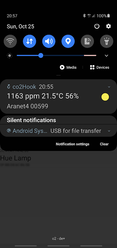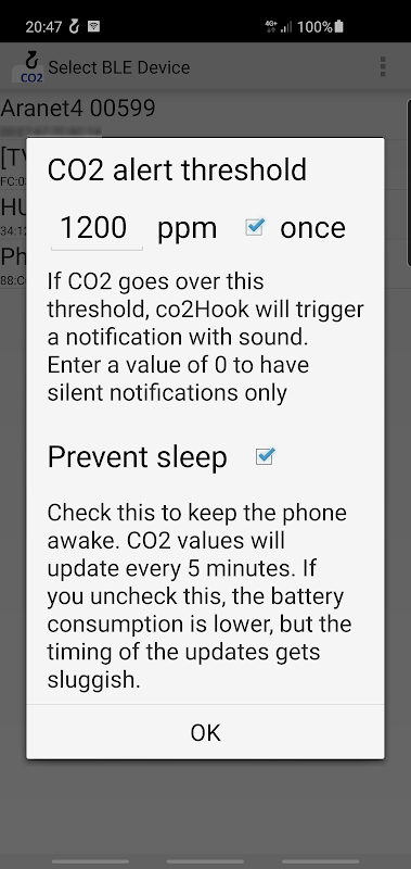 co2Hook connects to the ARANET4 device vial Bluetooth LE, gets it's current measurements and shows them as an Android notification. For CO2 measurements, you can configure a threshold. If the measurement is above that threshold, co2Hook will notify with sound and vibration. Android Wear notifications are supported as well. You can get an ARANET4 device here: https://aranet4.com/. Feel free to raise a pull request if you want co2Hook to support other CO2 measurement devices.