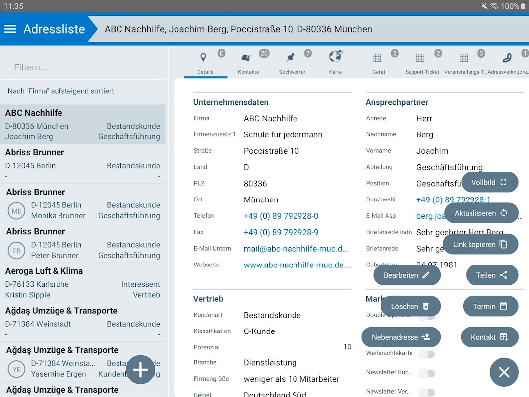 • Address data, contact history, keywords, additional data, appointment calendar, and sales projects. All relevant information from cobra CRM is available on mobile devices