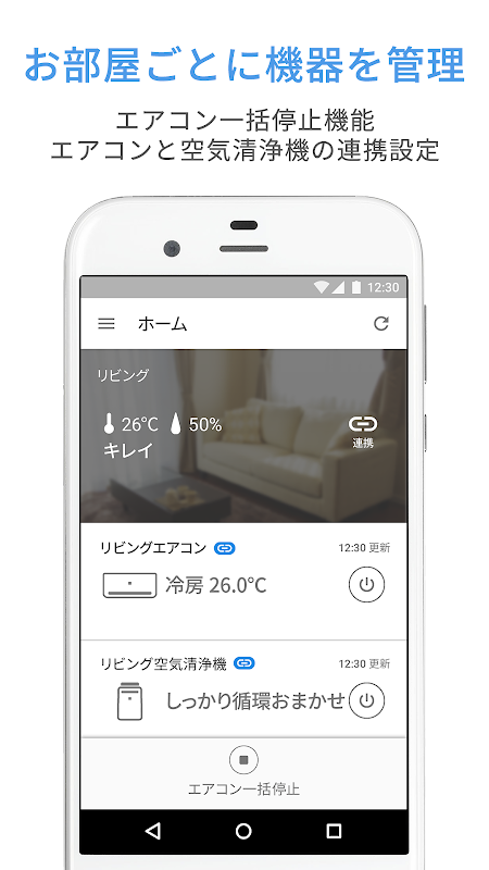 You can operate the air conditioner and air purifier registered as equipment from inside or outside the house, and you can check the air information in the room and the operation history of the equipment.