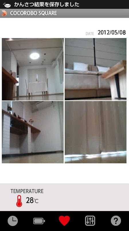 COCOROBO turns 360˚ and takes pictures around it. The pictures taken by COCOROBO will be saved into the smartphone. (Create directory named "The picture taken date and time" in the "Pictures/COCOROBO"directory of external storage and save 4 pictures in sequence.)