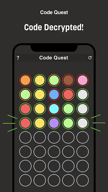 After each guess, the circles will get bordered by a ring to show how close you were to the right colour code.