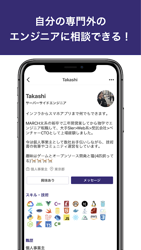 It is an SNS application for engineers who can meet fellow engineers and development projects.