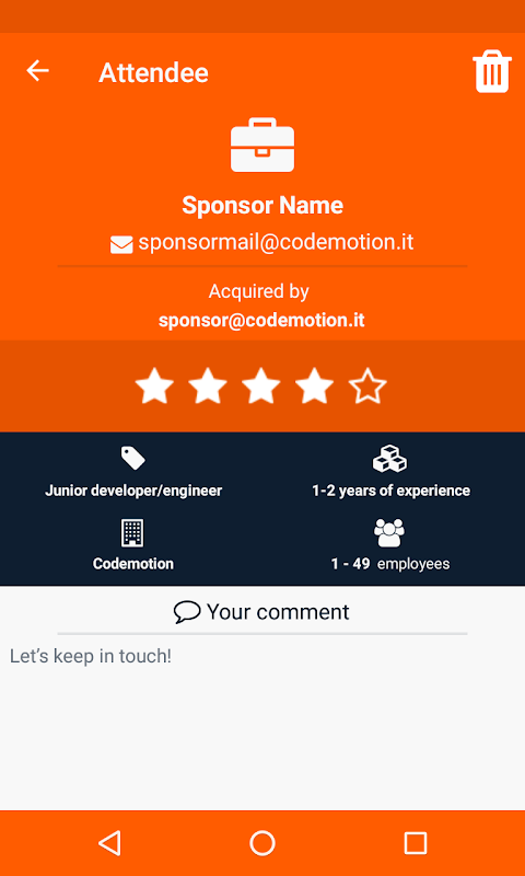 Codemotion is an international IT conference. The Codemotion Sponsor app allows the sponsor companies to acquire information about attendees' profiles during the conference, scanning their badges in order to start a potential hiring process.
