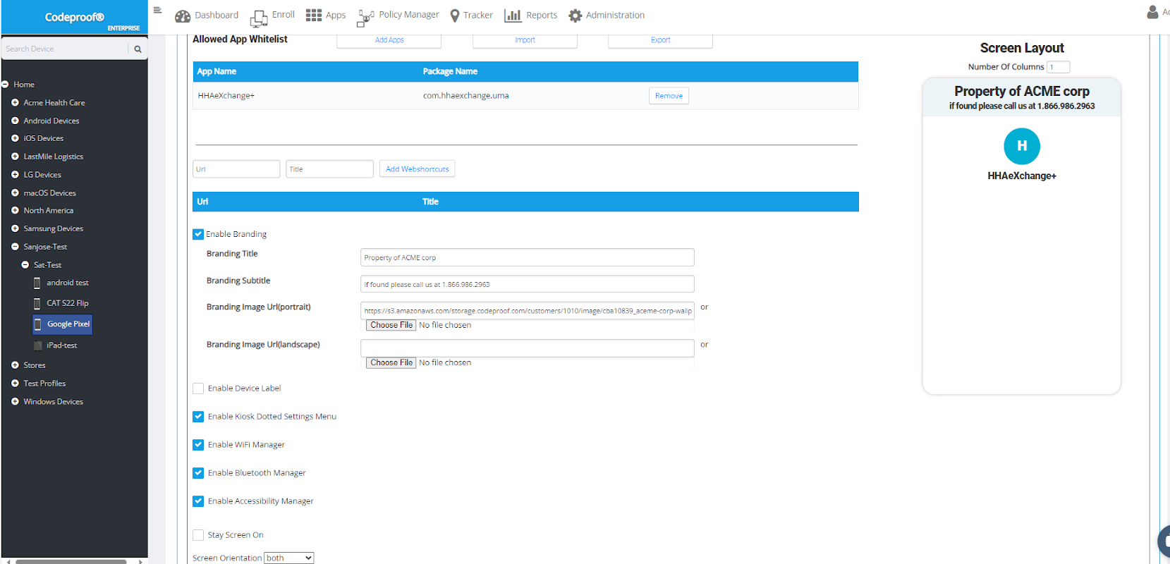 The Codeproof MDM/UEM platform delivers an advanced, secure mobile kiosk management solution tailored for Android and iOS devices. IT Administrators can centrally manage and configure mobile devices, seamlessly pushing settings to all enrolled devices. This includes customizing screens, background wallpapers, and other device settings, all manageable remotely. Changes are implemented instantly, ensuring that devices reflect the latest configurations without delay.