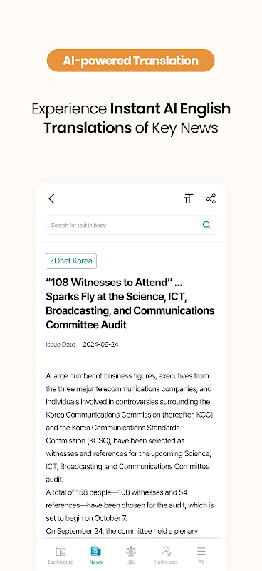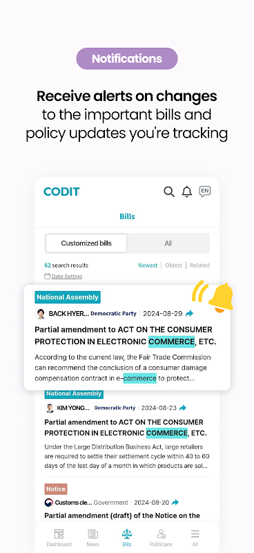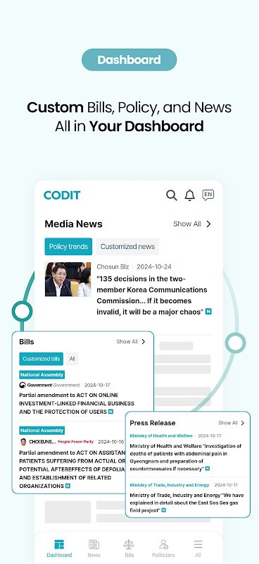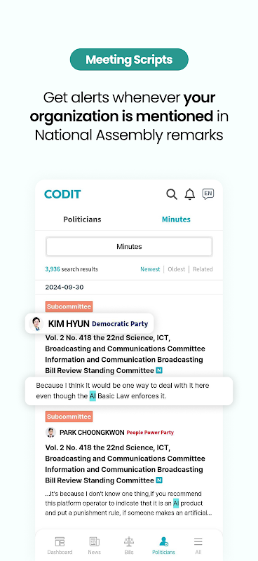 CODIT is an all-in-one monitoring platform that leverages artificial intelligence and big data to provide customized monitoring of legislative and government policy information. With CODIT's powerful monitoring capabilities, you can stay ahead of the rapidly changing policy environment. It offers real-time monitoring of both National Assembly and government activities and allows you to track and share the most relevant information for your company through a customized workspace. Furthermore, CODIT’s AI-powered real-time translation ensures that crucial legal and policy data can be promptly translated into English when needed. Download CODIT now to easily and quickly access policy and legislative data in one place!