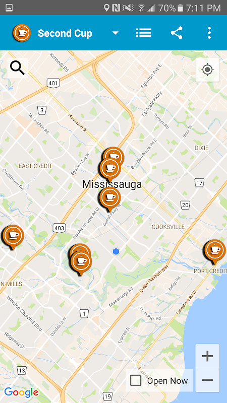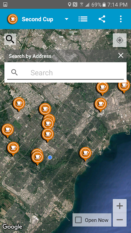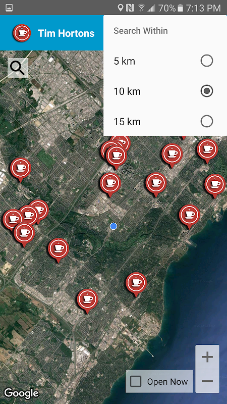 - Map view shows your current location and the location of Tim Hortons/Starbucks/Second Cup or Other Coffee Stores .