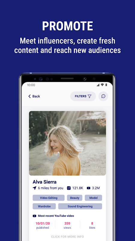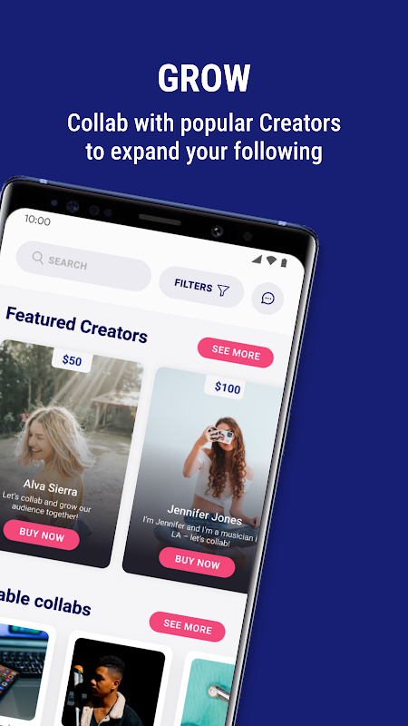 > Collab with creators & freelancers: Collaborations are a powerful way to reach new viewers, and they help you forge connections to grow your audience. Swipe through your daily batch of potential collab matches, post collab projects, or use advanced search features to find other content creators to collaborate with. You can also find creative freelancers for hire, whether they are influencers musicians, producers, photographers, stylists, or artists of any kind.
