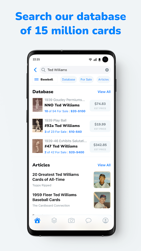 Search 17+ million cards in our database. See what cards on CollX are listed for sale right in search results. And if you find a card you own, but don’t have it handy to scan, you can easily add it from any of the records in the CollX database.