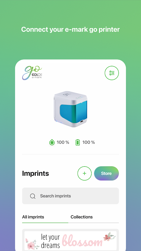Print your designs with the e-mark go in full colour. Connect directly via the app, a Wi-Fi connection will be established. Put the printer on an absorbent surface and move either to the left or right side, lights will show you where your design will be printed.