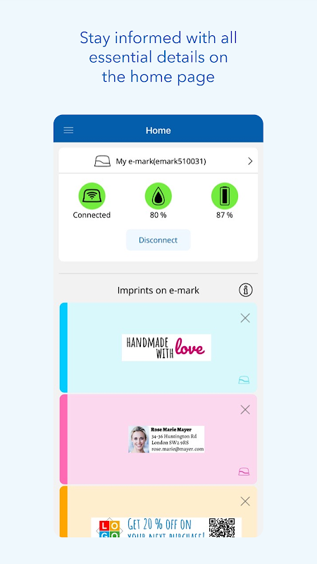 - Seamless connectivity: Connect your e-mark device to the app via WiFi for quick and easy printing your custom designs.