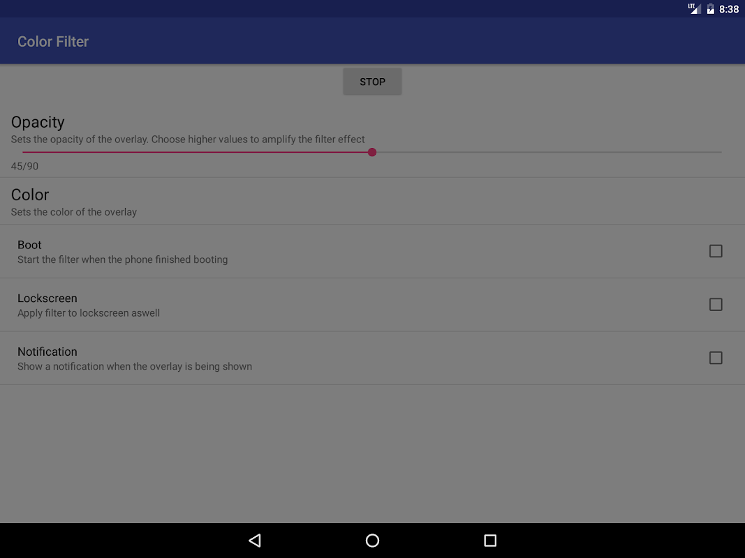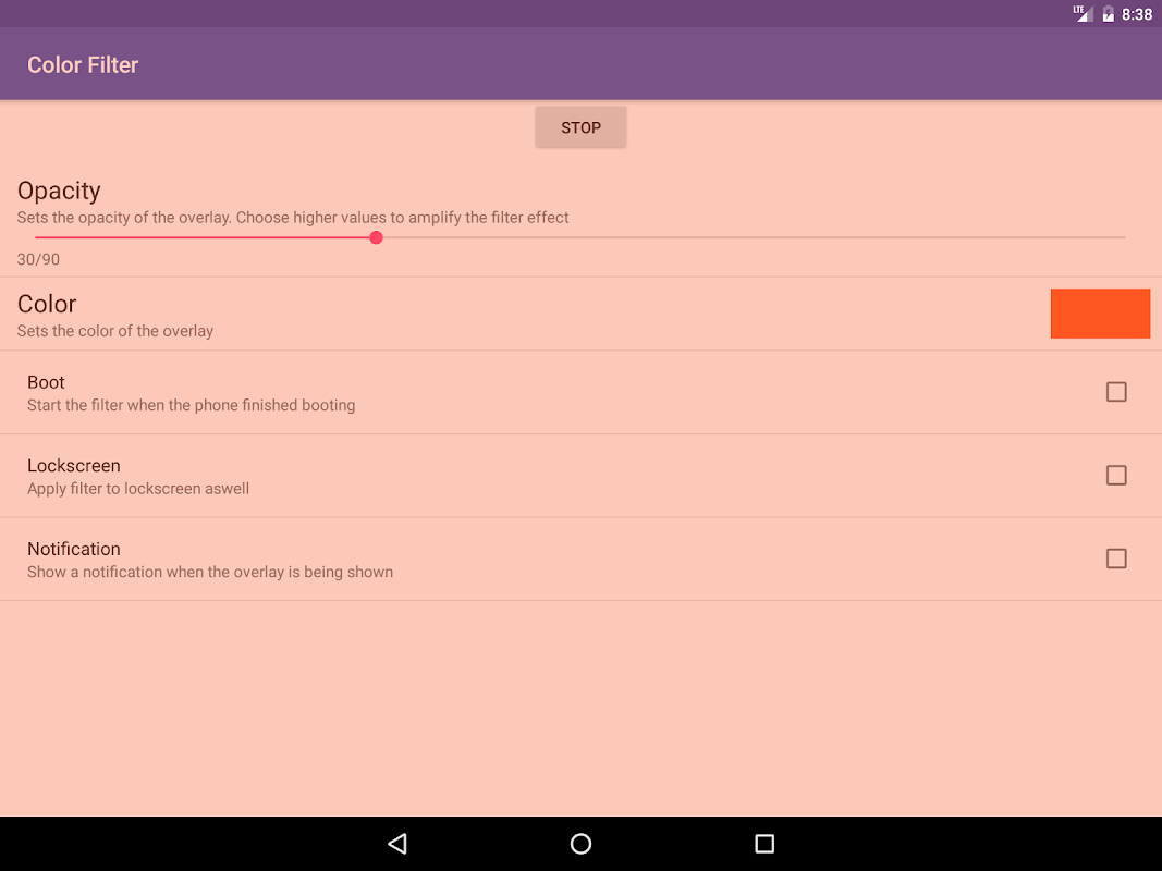 Additionally screens with a tint of blue have been associated with insomnia when stared at before going to sleep. By selecting a red or yellow filter some of the blue colors emitted by your device aren't shown anymore which might prevent this (No scientific confirmation on the effect of this app)