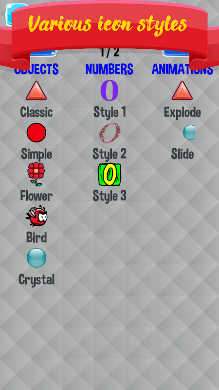 ◆ Change icons. By default your board will spawn regular colored balls, but you can freely change those. You can pick exploding ones, birds, sliding, and even Fruit or Cartoon icons.
