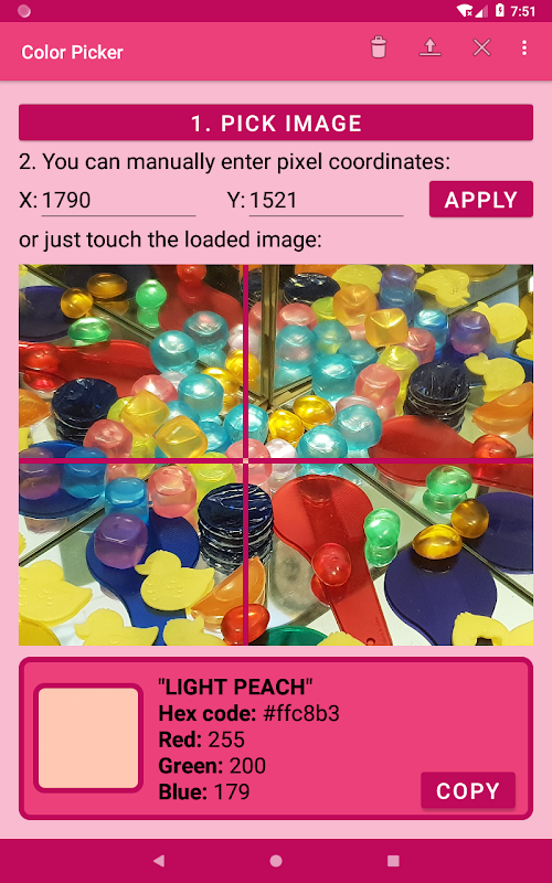 - Then you can enter x,y coordinates manually and press "Apply" -or- you can just touch the desired point directly at the image control. The visual control allows you to zoom in/out with typical gestures, allowing you to choose precise coordinates there.