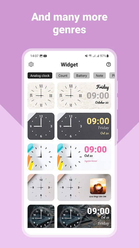 + Photo Widget: Helps you bring photos from your device to your home screen with a number of available shapes.