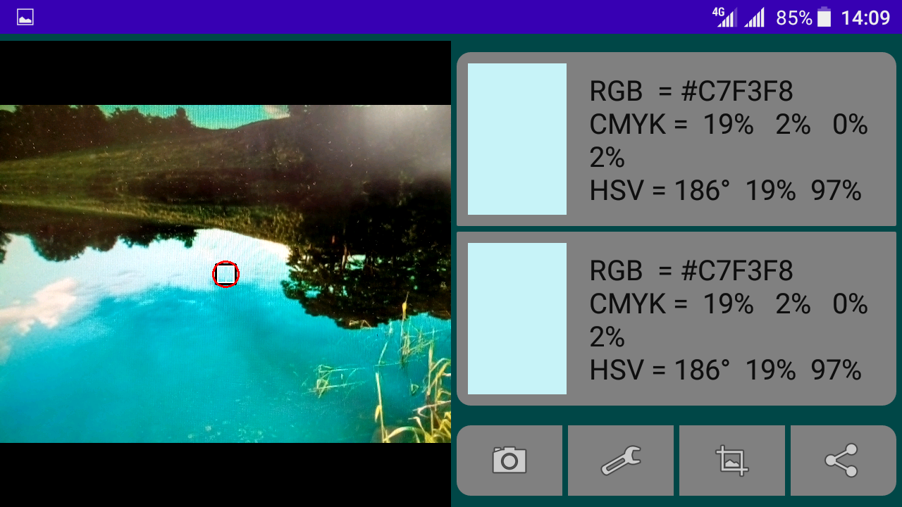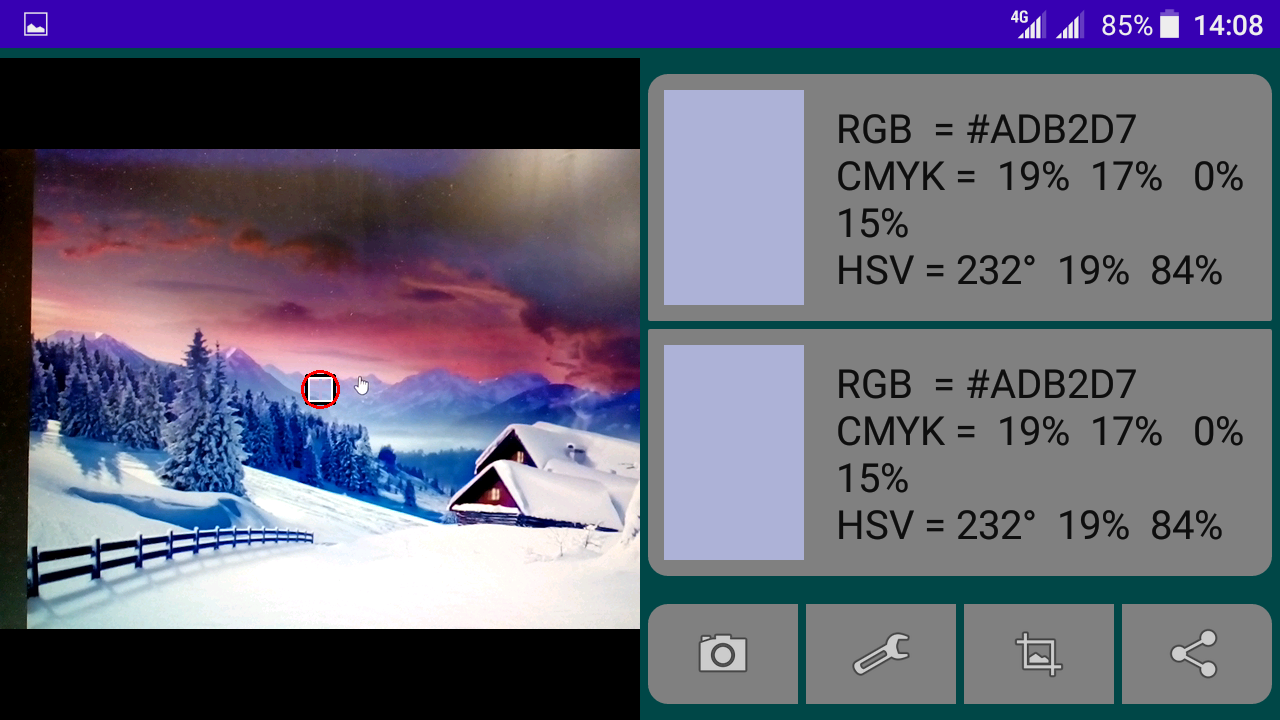 Color picker ( RGB, HSV, CMYK, RAL CLASSIC) from the camera in real time.