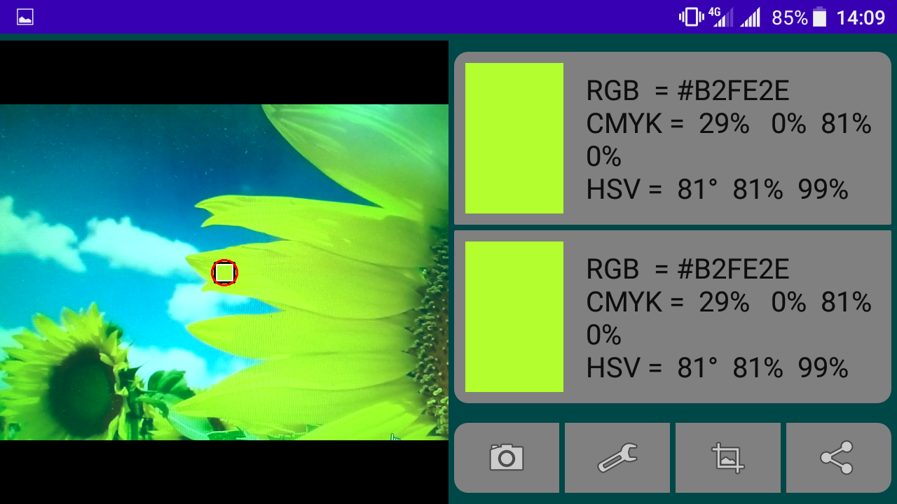 Color identification (Color picker) in real time from you camera in RGB, HSV, CMYK.