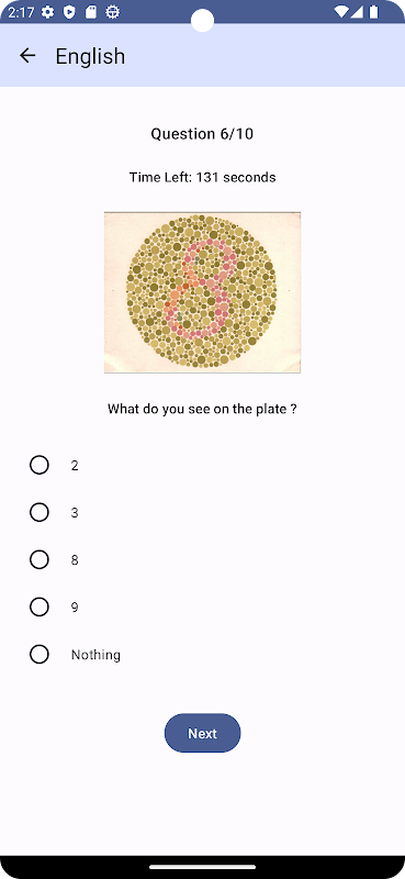In this app Ishihara Test presents a series of plates containing dots arranged in different colors and sizes. Individuals with normal colour vision will distinct numbers or patterns within the plates and chose correct option.
