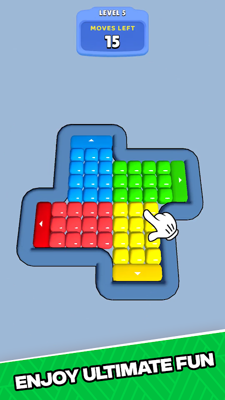 Each level presents a unique challenge, with more colors and intricate shapes to deal with. Swiping in any direction moves all the blocks on the board, so think carefully about your moves and plan ahead to clear the board!