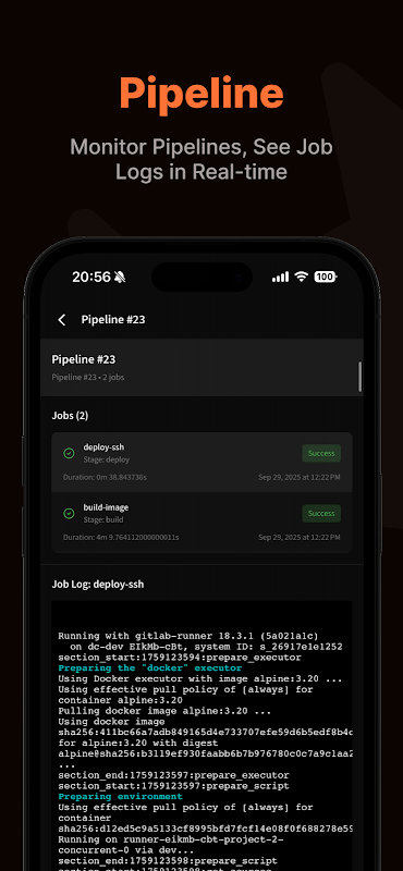 🛠 Monitor pipelines & jobs – Track progress, view logs with syntax highlighting, and quickly spot failures.