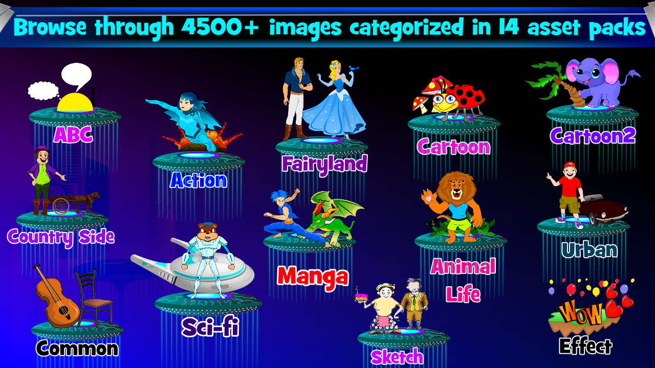 Create awesome comics using 6000+ free images (characters, background, objects) categorized in following 23+ asset packs: