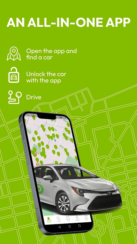 • Rent a carshare at low cost for a few minutes, an hour, a day or more and unlock it with the app!