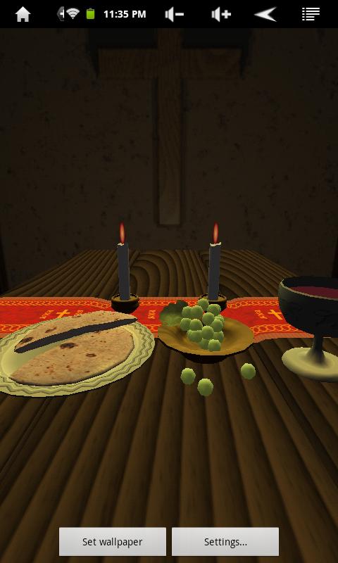 "...do this in remembrance of me." A Christian Holy Communion live wallpaper showing an attractive 3D candle light setting depicting our Lord's table. The view rotates bringing attention to the broken bread and the red wine. You can customize the table's wood, table runner, show metal or wood cup and plate and change the color of the grapes. The candle flicker provides a warm inviting environment to this communion scene. There is even a "low detail" option for slower devices.