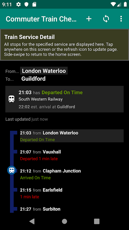 Tap on any individual train service to see a detailed breakdown of all the station stops on that service, along with the live train time status at each stop. This detail is shown on a screen to the right of the home screen, and you can side-swipe between the two screens. These two screens are related, but separate, meaning you can keep an eye on the detailed status of a train on the detail screen (refreshing it periodically) whilst swiping back to the home screen to look at the status of all the train services for that journey.
