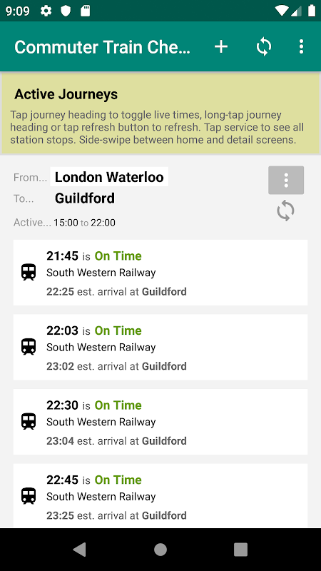 Set up your regular journeys, specifying the time windows in which you would usually make them. Depending on the time of day that you open the app, the journeys applicable at that time (the "active" journeys) will be presented first Take advantage of the "spotlight" feature to show specified journey(s) at the top of the home screen at all times.