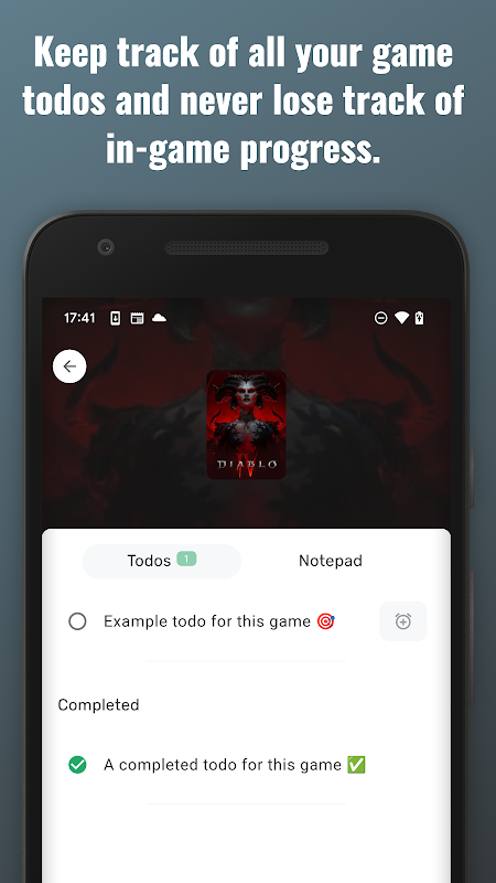 With our intuitive quest tracker, never miss out on any mission or side quest. Organize your game-related tasks efficiently with our game to-dos function, ensuring you always know your next move. Dive deeper into your gaming experience with our in-game reminders, ensuring you're always on top of your game.