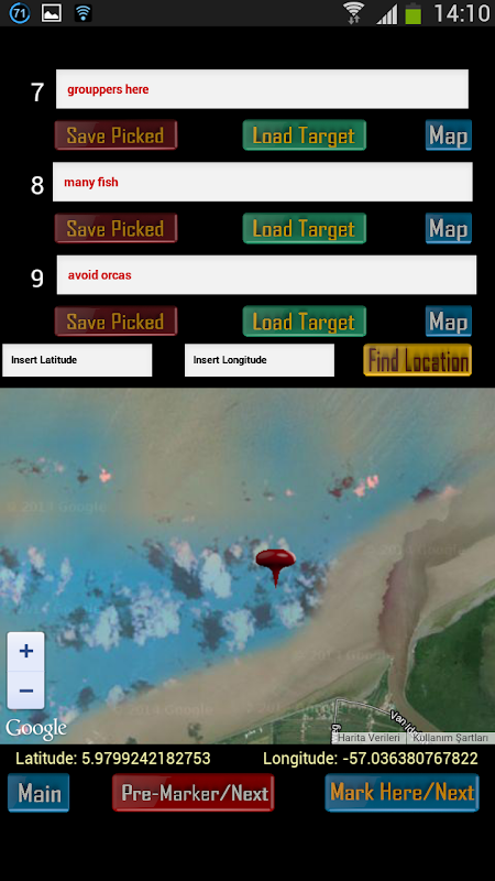 Select “Pre-Marker/Next” Select Name Area>>> Write Your Location by Using Latitude and Longitude Data into “Insert Latitude” and “Insert Longitude” boxes respectively. Data insert format is ex. 34.4567. >>> Click “Find Location Button” >>> Save Picked Location by Pressing “Save Picked” Button.