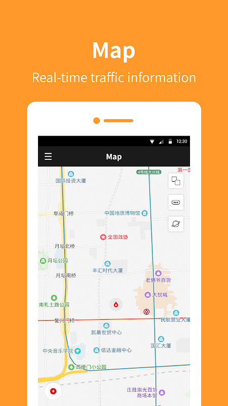 - Support map function, display surrounding traffic information, real-time traffic information, satellite map display