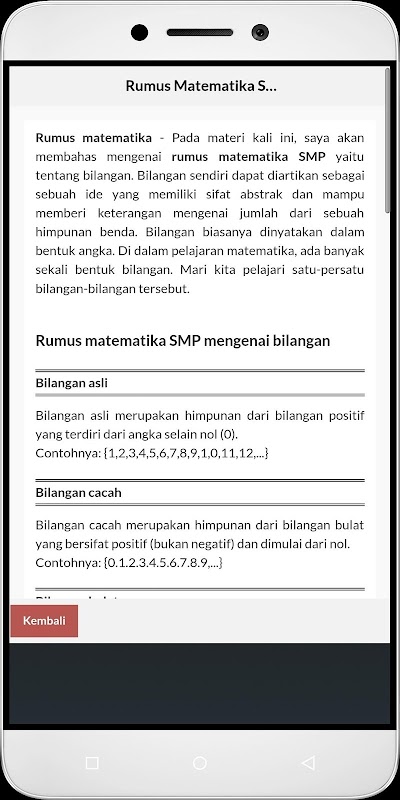 Mathematical formula is the formula used to work out a matter of mathematics lesson to get the appropriate results. Mathematical formula is very much the kind and if we want to master all the mathematical formulas it is very difficult if we just memorize it without writing it into a notebook. For that we make a collection of complete mathematical formulas ranging from ladder sd, smp and sma is in this application.