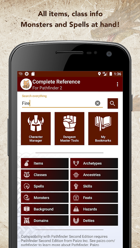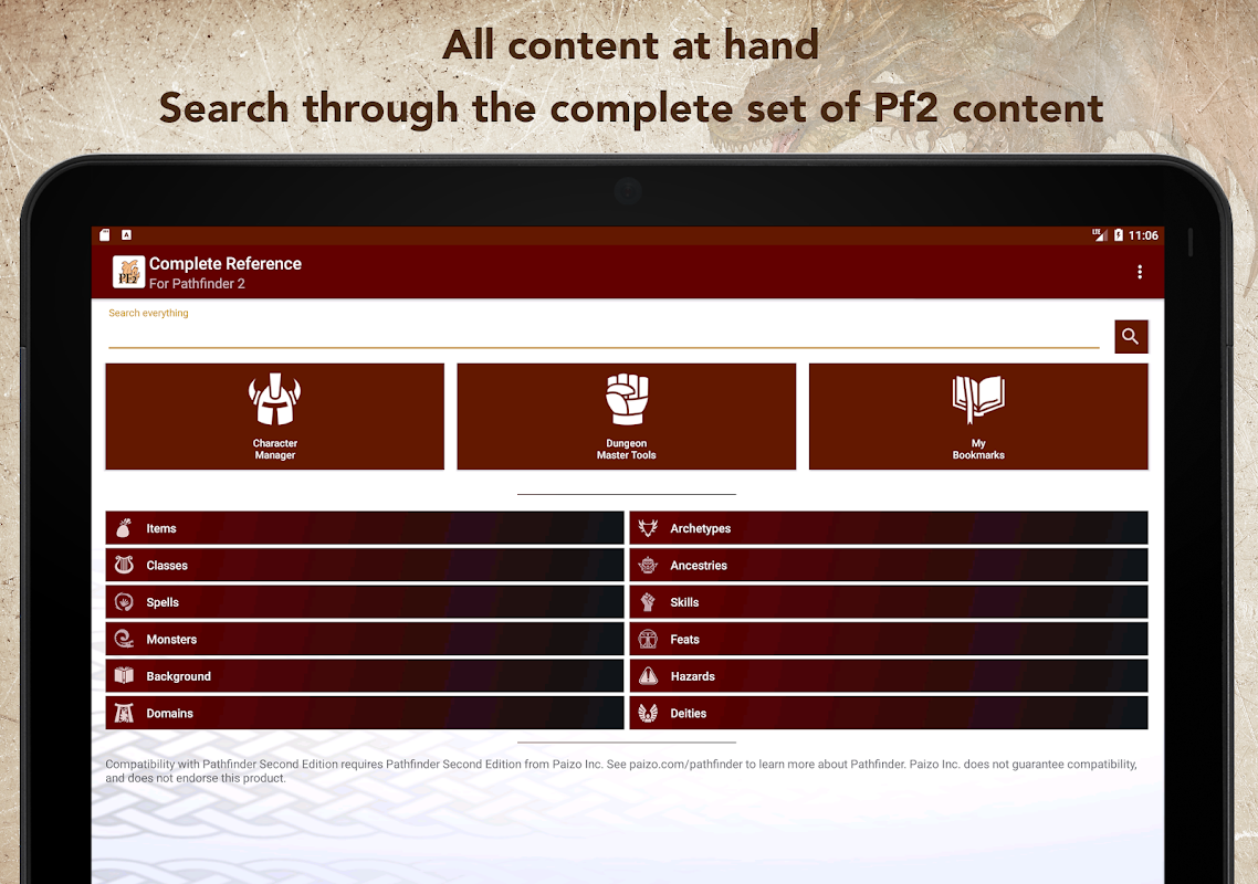 With the Complete Reference app for the Roleplaying Game Pathfinder Second edition, you have all content at hand in a searchable and handy format.