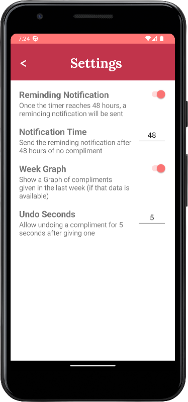 The App contains a timer telling you how long it's been since you've given someone a compliment. If you give a compliment to someone, you can reset this timer. Once this timer reaches a configurable threshold, you get a reminding notification to compliment someone. It's a really simple app that's supposed to keep people happy.
