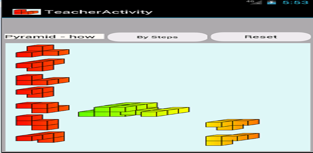 The application is a game for drawing a composite figure with the smallest volume of 27 cubes connected in seven figures. Also to draw a figure with the smallest surrounding surface. Can be formed a rectangular prism. The application shows the seven figures in 6 variants and has a teacher for the first two problems.
