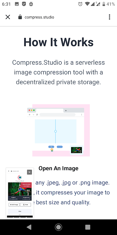 Compress.Studio is a serverless image compression tool with a decentralized private storage.Compression for large sized images. Private and Secure Storage. Access from anywhere.