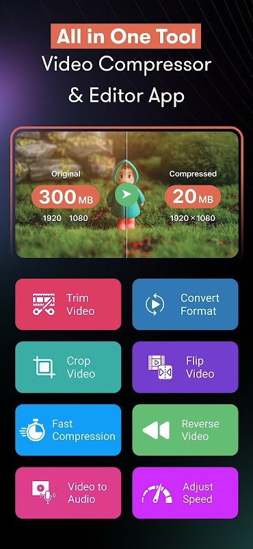 with This App, You Can Compress Video, Resize Video, Crop and Trim Video, Rotate Video, Reduce Video Size, Shrink Video File Size, Compress Files, Zip Video, Flip Mirror Video and Merge Videos – All in One Place.