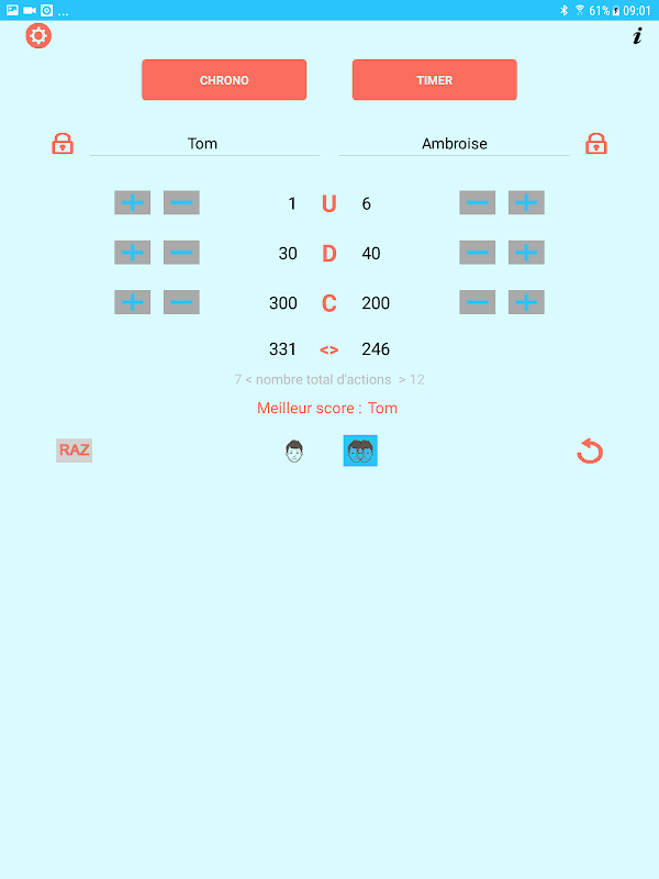 The application is based on the work done by S. Bellard "When the quantitative reveals the qualitative", EPS review n ° 321, September-October 2006 where is presented the System of Counting points by Differentiation Units (SCDU) . The SCDU counting system assigns a particular criterion from the least efficient to the most efficient for units, tens, hundreds and thousands. The scores obtained provide both quantitative and qualitative data. UDCM Counter - Units, Dozens, Hundreds and Thousands - reveals a "speaking score" by reporting the nature of the actions performed and their quantity. The Evaluating Competence Evaluation System (DERC) uses this same principle (see article of the Pedagogical Café below). The maximum number of criteria is 4, by default 3 are available but the number can be modified in the parameters (from 2 to 4) to limit the number of information to be managed by the observer and the pupil / team evaluated (e). The Counter allows you to observe 1 or 2 players / teams and proposes to associate a timer or a timer configurable.