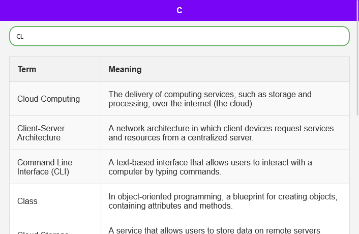 Search Functionality: This computer science dictionary app has search feature. Find the exact term or concept you need with our robust search feature. Whether you're looking for a specific definition or exploring new topics, our search tool provides fast and accurate results.