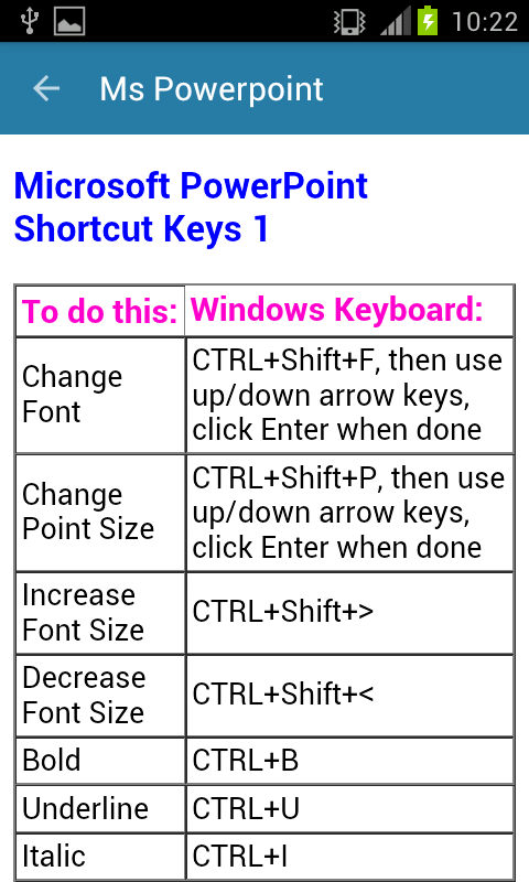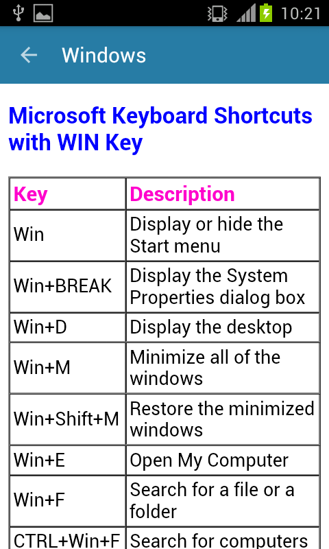 Computer Shortcut Keys Guide is best educational free application currently available on play store for all Android device users, which makes you aware of computer shortcuts of all platform like Windows, MS office and DOS