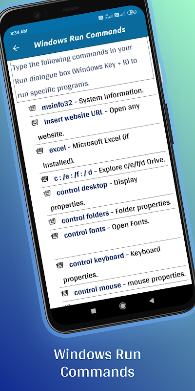“Computer Windows Shortcut Keys” Application is the best windows shortcut dictionary app. This application provides many shortcuts tricks so you can increase your work speed and saving your time. Our app provides different shortcut keys for various application in the computer so you may use all software easily. If you want to use keyboard shortcuts instead of mouse than this app helps you to increase your computer knowledge. This computer shortcut keys is educational application who make it easier to interact with your computer app and you love to do your computer job because of this application.