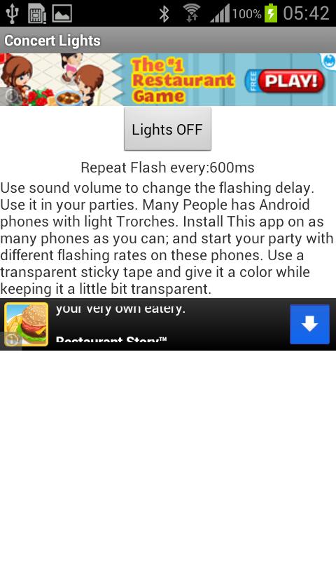 Use sound volume to change the flashing delay. Use it in your parties. Many People has Android phones with light Torches. Install This app on as many phones as you can; and start your party with different flashing rates on these phones. Use a transparent sticky tape and give it a color while keeping it a little bit transparent.