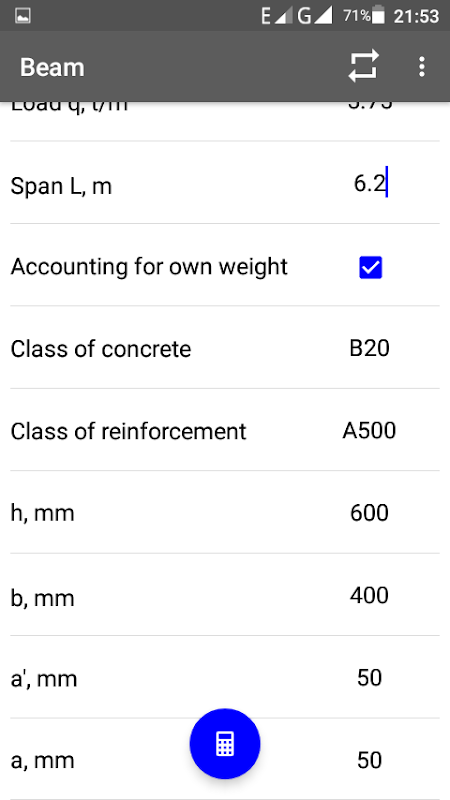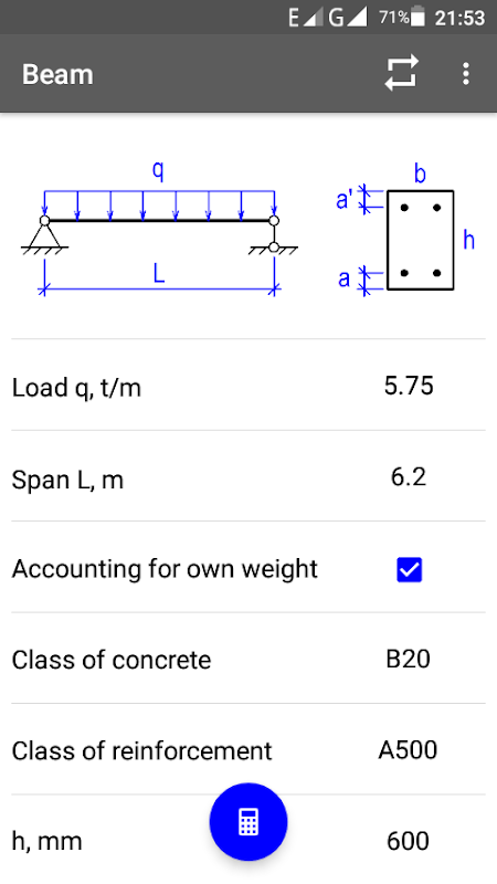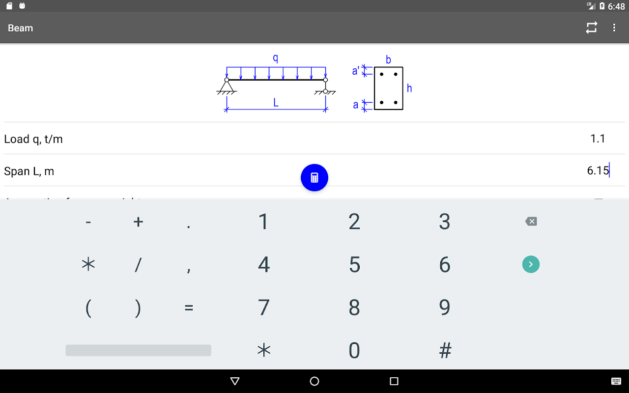 The app selects the cross-sectional area of the reinforcement of the reinforced concrete beam.