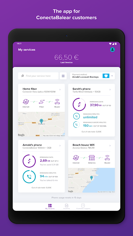 The Official ConectaBalear App allows you to check your invoices, the telephone usage or the call details. You will be able to configure your Internet connection and much more.