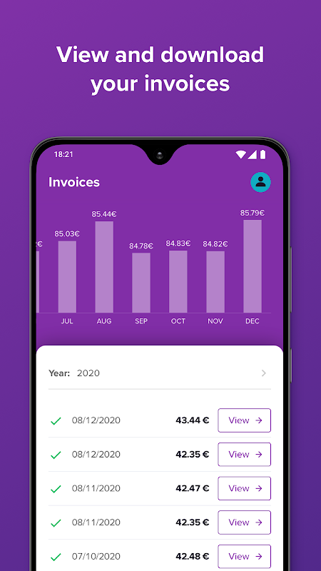 Access your invoices from our app, you will be able to download them to your device and view them at any moment with a PDF reader.