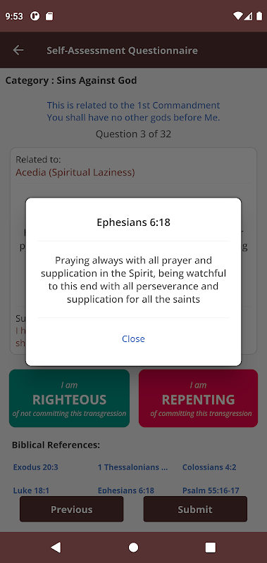 Each question is rooted to the ten commandment and supported by verses from the bible. Additionally, to help you understand the offenses, the questionnaire is divided into three categories of: Sins against God; Sins against my neighbors; Sins against myself. At the end of the examination questions, a text box allows you to type in any additional offenses that might be on your mind.