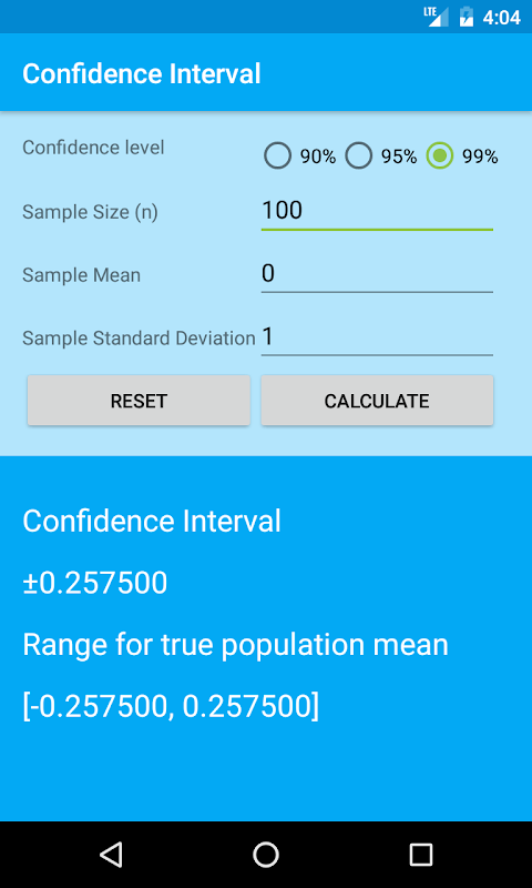 Confidence intervals consist of a range of values (interval) that act as good estimates of the unknown population parameter. However, the interval computed from a particular sample does not necessarily include the true value of the parameter. When we say, "we are 99% confident that the true value of the parameter is in our confidence interval", we express that 99% of the hypothetically observed confidence intervals will hold the true value of the parameter. After any particular sample is taken, the population parameter is either in the interval, realized or not; it is not a matter of chance. The desired level of confidence is set by the researcher (not determined by data). If a corresponding hypothesis test is performed, the confidence level is the complement of the level of significance, i.e. a 95% confidence interval reflects a significance level of 0.05. The confidence interval contains the parameter values that, when tested, should not be rejected with the same sample. Confidence intervals of difference parameters not containing 0 imply that there is a statistically significant difference between the populations.