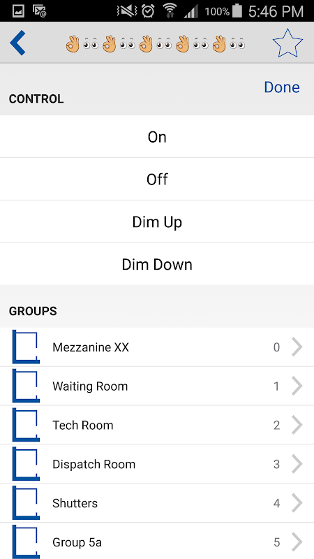 Select and favourite DALI light groups, lines or addresses for control. Control the lights with scenes, on, off or arc level sliders.