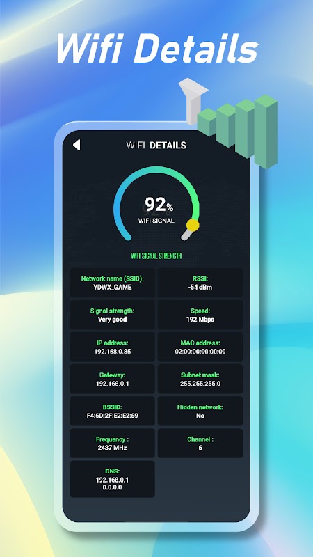 ConnectHunt is a streamlined and user-friendly application designed to enhance your WiFi experience through three core features: WiFi details, nearby WiFi, and speed testing. Through WiFi detailed information, users can easily view comprehensive information about their current network, including signal strength, MAC address, IP address, and speed. The nearby WiFi feature allows you to quickly scan and discover available networks nearby, helping you find the best connection options. Finally, the speed testing tool provides accurate and real-time download and upload speed measurements to ensure that you can easily monitor your Internet performance. ConnectHunt focuses on these basic features, providing lightweight and efficient solutions for all your WiFi management needs.